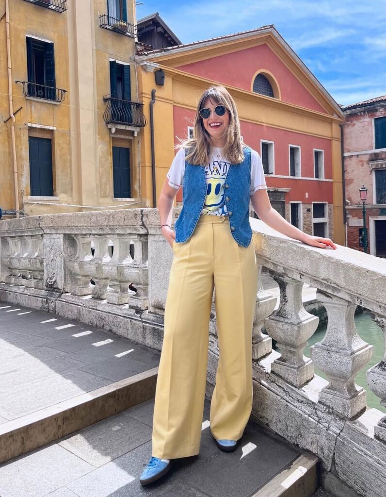 Denim vest layered over a graphic tee with wide yellow tailored trousers and blue shoes in Venice is so wonderfully colour blocked.
