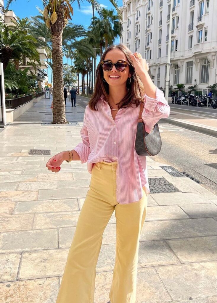 Pink striped shirt half tucked into butter yellow wide leg jeans with a designer monogram bag and tortoiseshell sunnies.