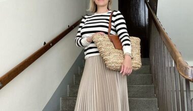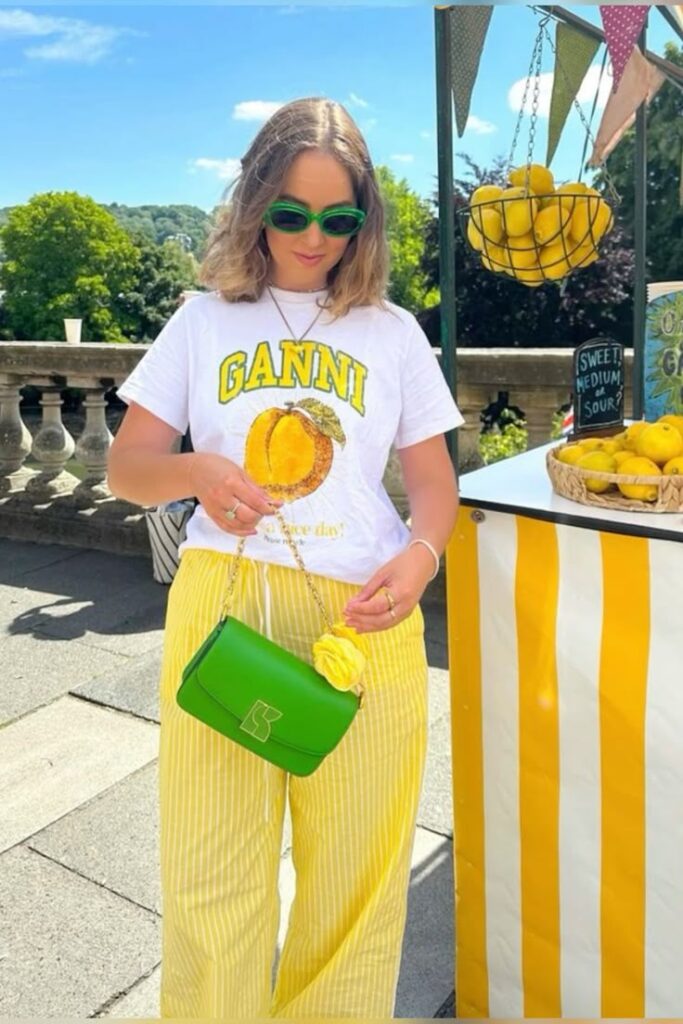 Honestly the green bag against yellow striped trousers is such a bold colour move and it completely pays off.