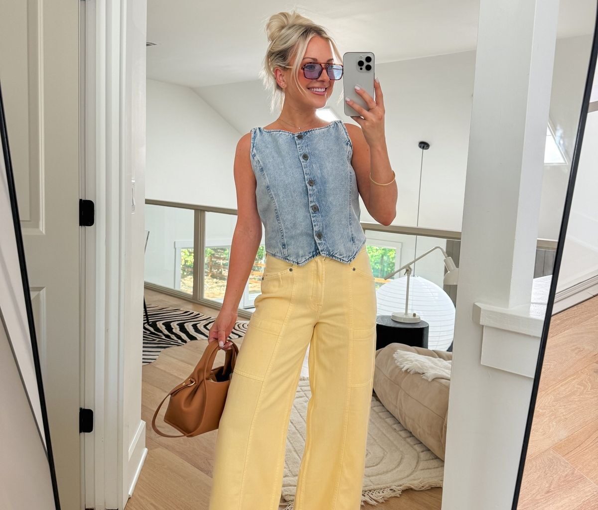 The denim vest top paired with butter yellow wide leg jeans and tan platform sandals is such a smart colour blocking choice.