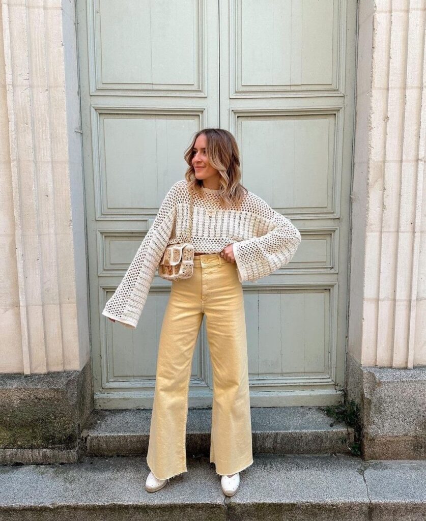 The open knit cream crochet top over butter yellow wide leg jeans is such a dreamy warm weather combination.