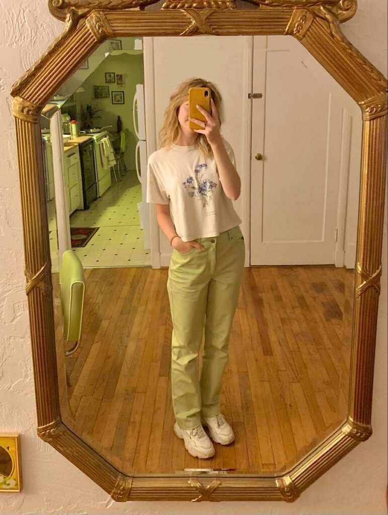 Okay so this is technically on the sage side of yellow but the green jeans with a botanical illustration crop tee and white chunky trainers is so cohesive and earthy.