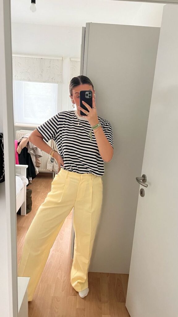 Oversized navy stripe tee tucked loosely into wide yellow tailored trousers with white trainers. This is the outfit for girls who refuse to be uncomfortable but still want to look pulled together.
