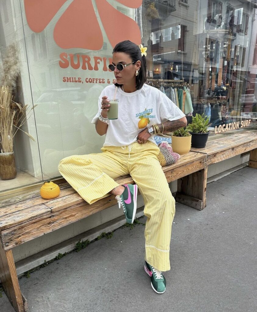 Relaxed yellow striped trousers, an oversized graphic tee and multi coloured Nikes that somehow pick up every colour in the outfit.