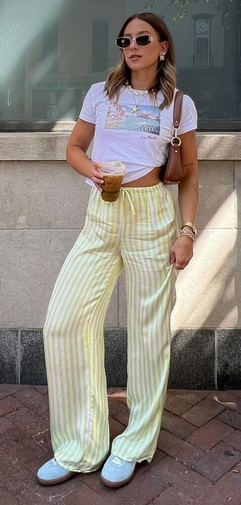 Lime yellow striped linen wide legs with a graphic crop tee, brown leather bag and pale blue sneakers is such a good spring weekend formula.