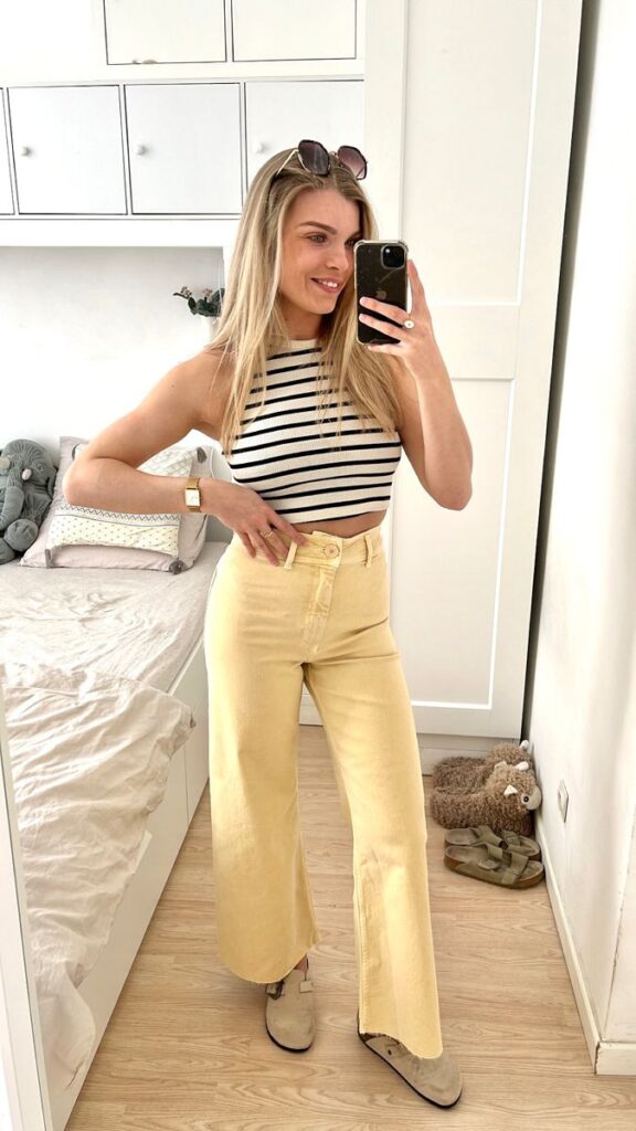 Classic navy Breton stripe crop top with high waist yellow wide leg jeans and flat mules. So simple you almost want to call it obvious, except it never actually goes wrong.