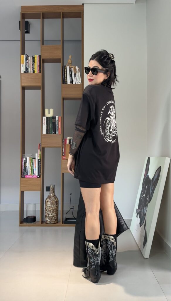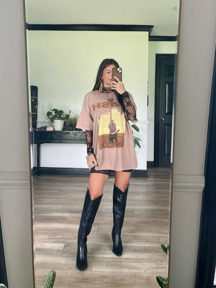 That oversized band tee works as a dress when you’ve got statement boots to anchor the look