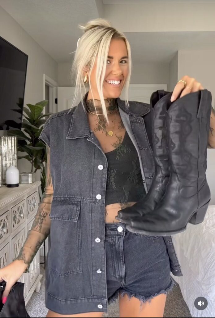 Okay, so outdoor festival vibes meet country concert energy here. Those light colored crops paired with denim cutoffs and tall boots?