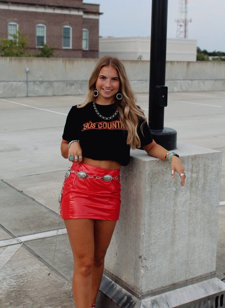 Okay so this is how you make a bold color choice work with vintage band merch. The red mini is eye catching but pairing it with a darker graphic tee keeps it from being too sweet or too much.