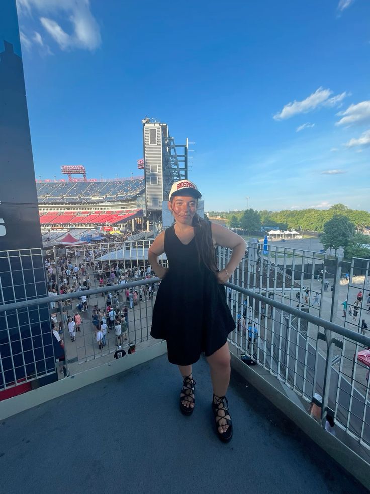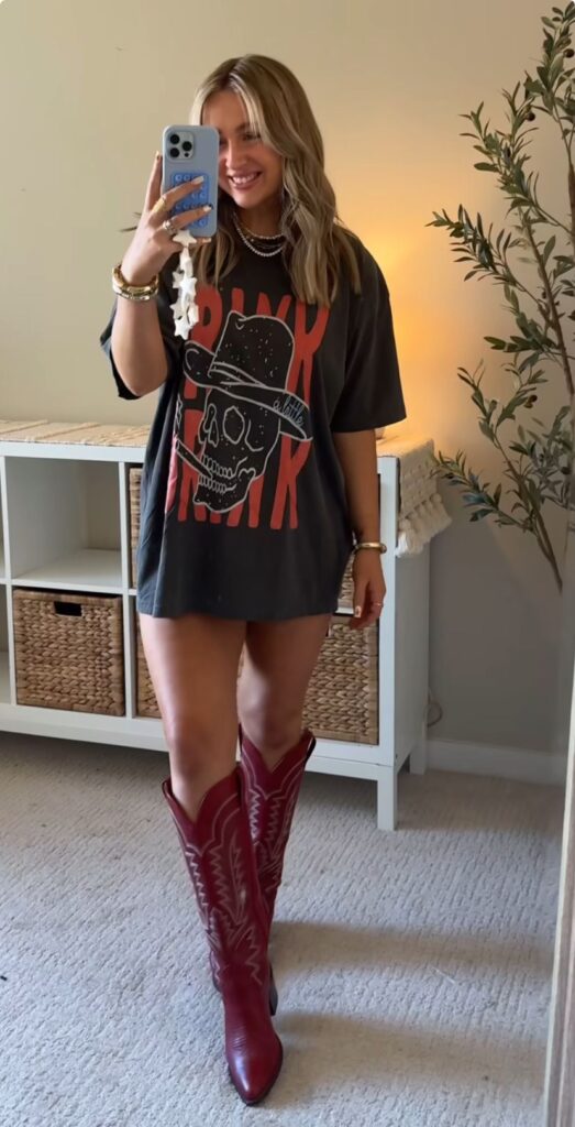 Keep it simple with the oversized tee as a dress and let the boots do the talking. Easy, fun, and you’ll blend right in with the crowd energy.